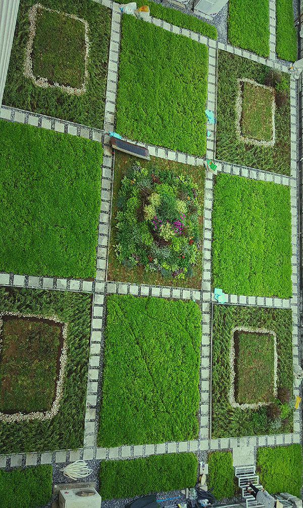 該屋頂綠化工程是在保持現(xiàn)有屋頂結(jié)構(gòu)的基礎(chǔ)上,對屋面防水進(jìn)行了二次處理,種植了模塊化的佛甲草等較強(qiáng)生命力的綠色植物,主要分布在高新區(qū)管委會辦公大樓的3至8層露天平臺及屋頂,面積約3000平方米。